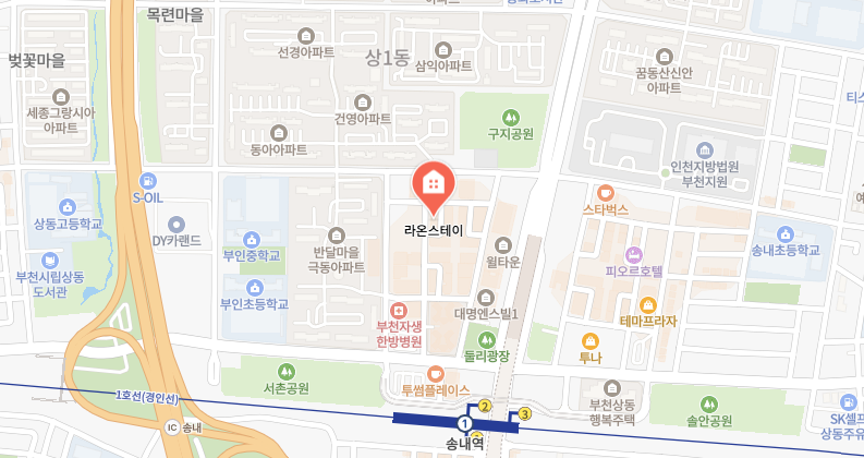 1호선 급행 송내역 5분거리 송내 로데로거리에 위치하고 있어 각종 편의시설을 이용하기 용이합니다.공원, 마트, 커피숍, 먹거리등 인프라가 부족함이 없습니다.